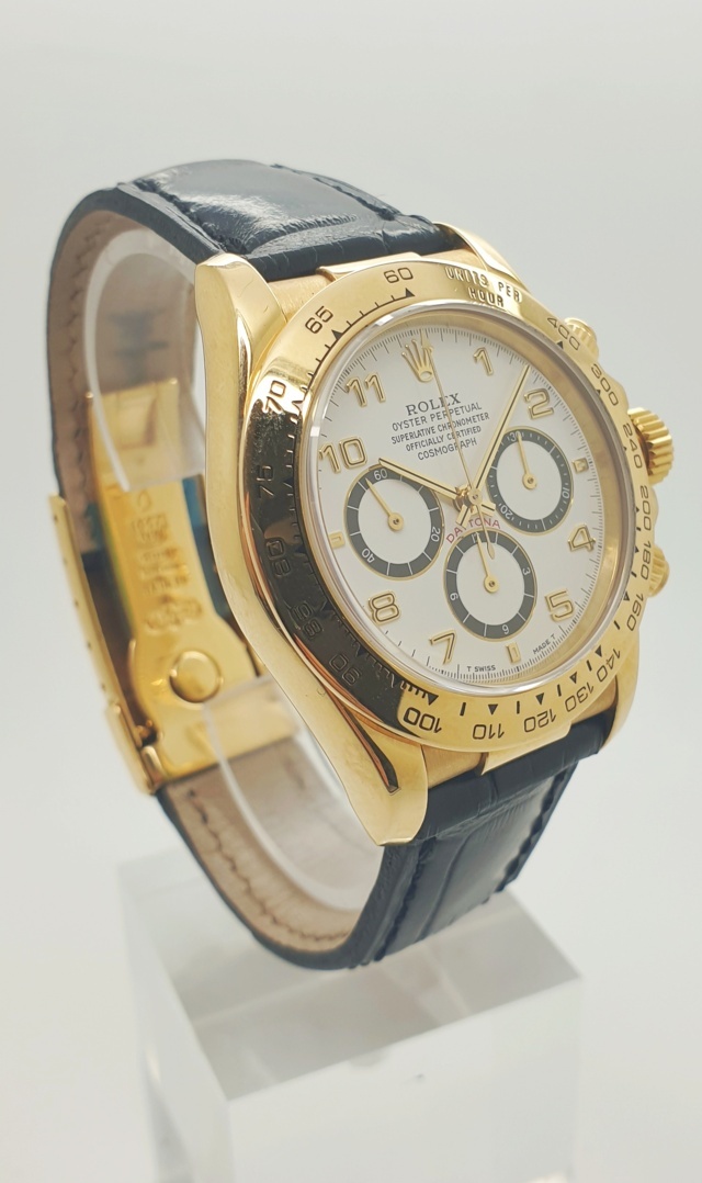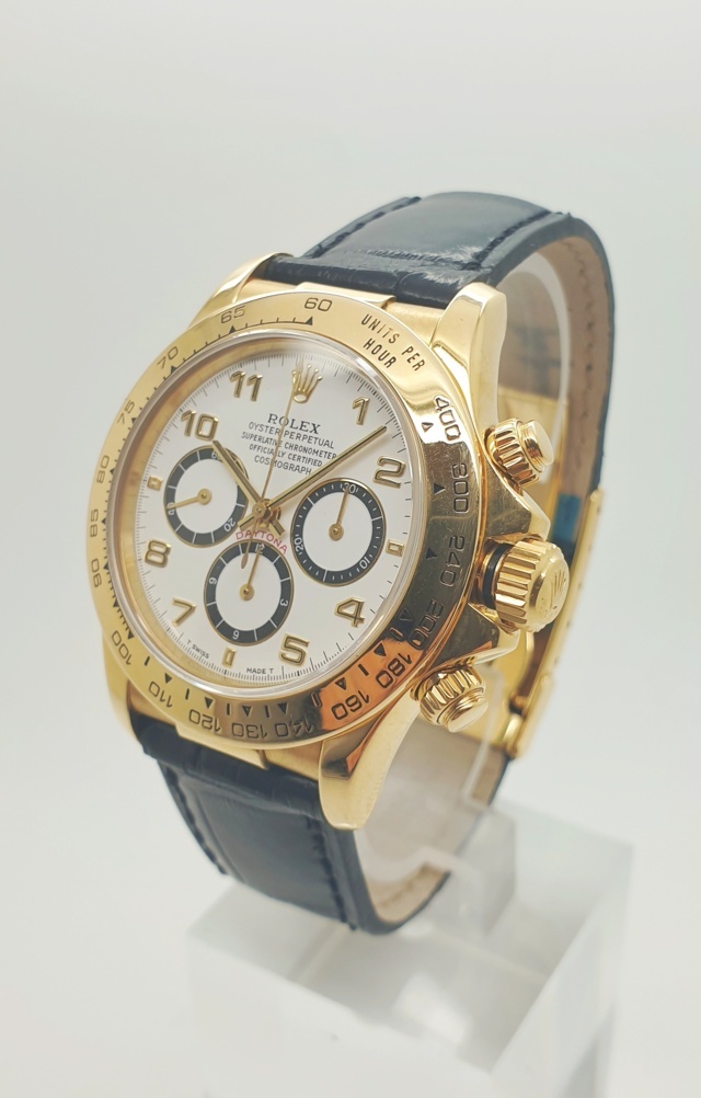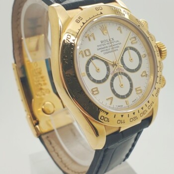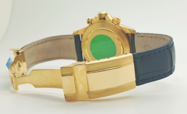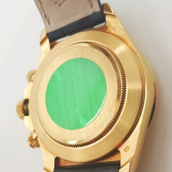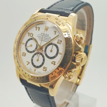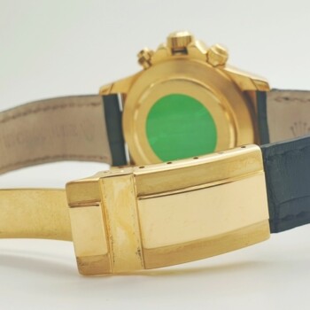 Rolex Daytona con cassa in oro giallo e cinturino in pelle.